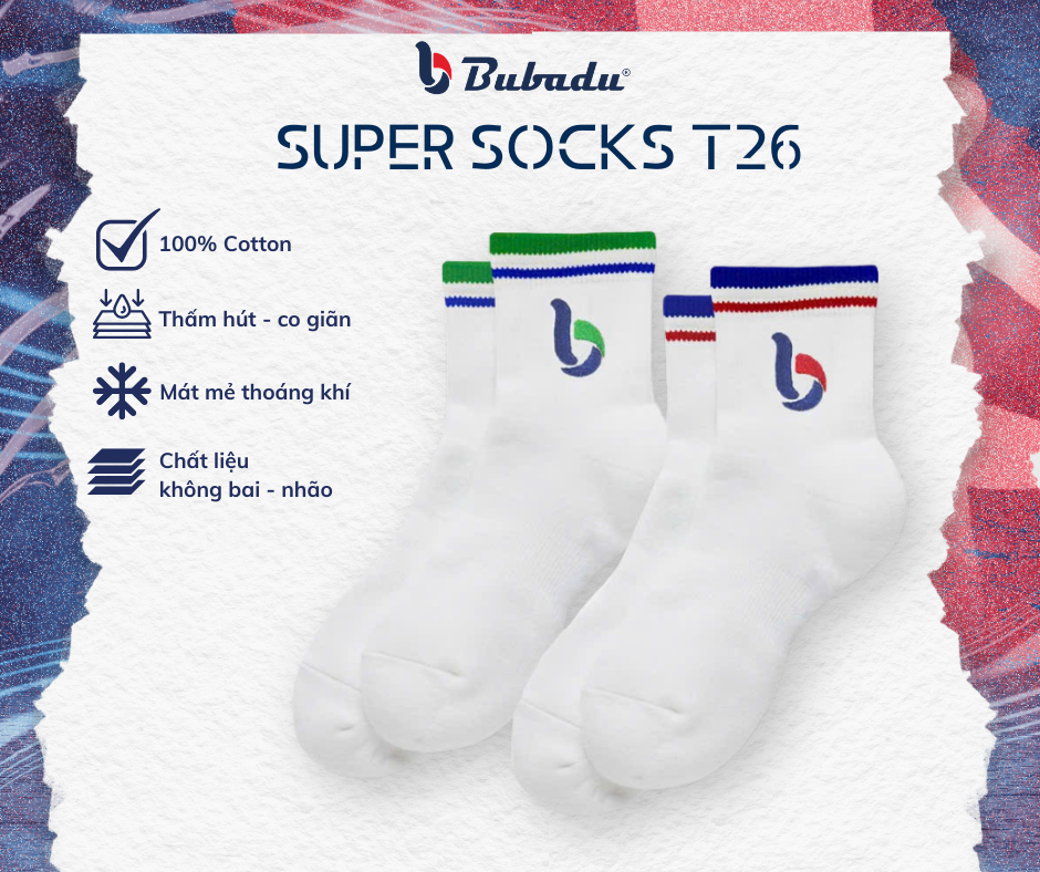 Nếu bạn đang tìm kiếm một đôi Tất thể thao cotton 100% êm chân, thấm hút tốt, Super Socks T26 của Bubadu là lựa chọn đáng cân nhắc cho outfit thể thao của bạn.