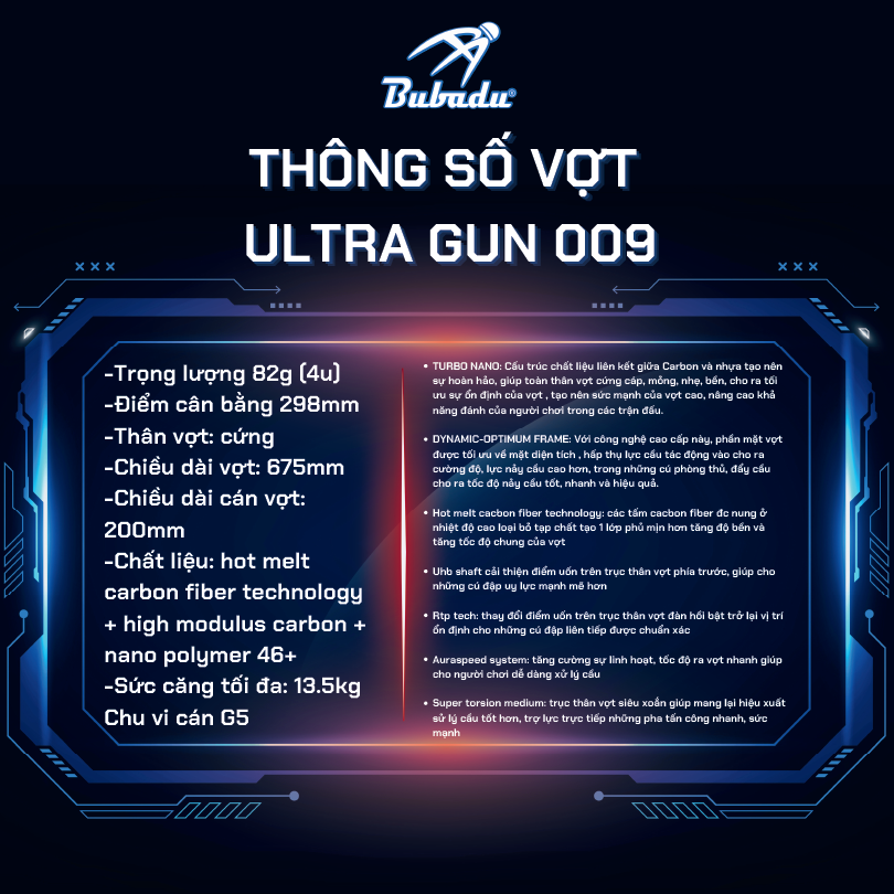 2. Thông số vợt cầu lông Bubadu Ultra Gun 009